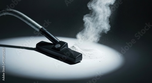 A black vacuum cleaner nozzle, positioned on a light surface, expels a cloud of dust and steam