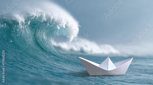 Paper boat sailing toward large approaching wave, innocence and inevitable challenge, symbolic tension