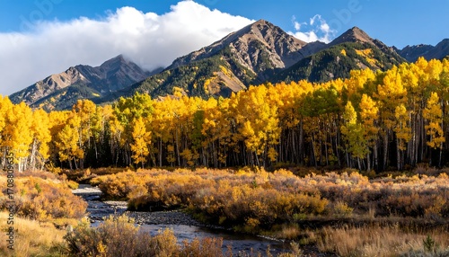 Golden aspen trees line a riverbank, set against a backdrop of majestic mountains under a vibrant autumn sky
