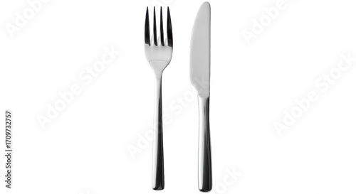 Isolated fork and table knife, close-up cutlery on bright background, serving items