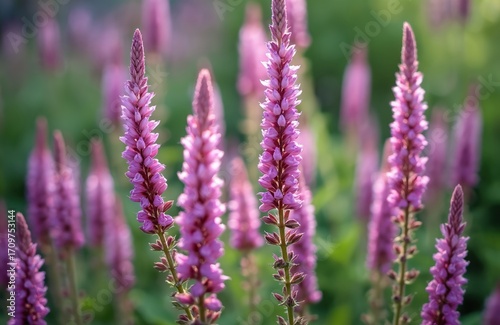 Close-up of blooming purple loosestrife flowers, Lythrum salicaria, in garden. Delicate pinkish-purple inflorescences on green stems under daylight. Selective focus on vertical flower spikes, summer