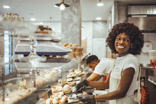 Smiling Bakery Employee Working Behind Display Counter in Cozy Pastry Shop