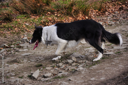 Żwawy border collie kroczy po kamienistej, gruntowej ścieżce z nastawionymi uszami i wystawionym językiem.