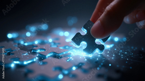 Puzzle pieces connect and create a glowing bloom in mid-air during a digital art representation of creativity