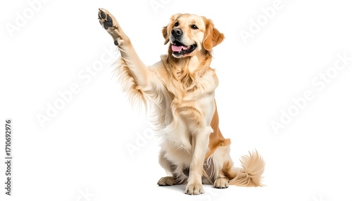 Golden Retriever sitting, paw raised