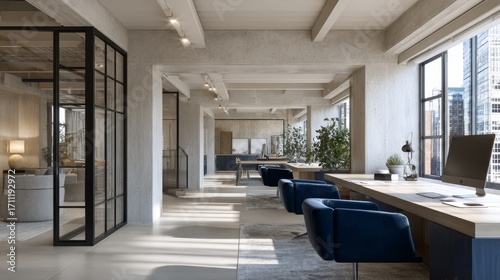 Modern office space with large windows and comfortable seating