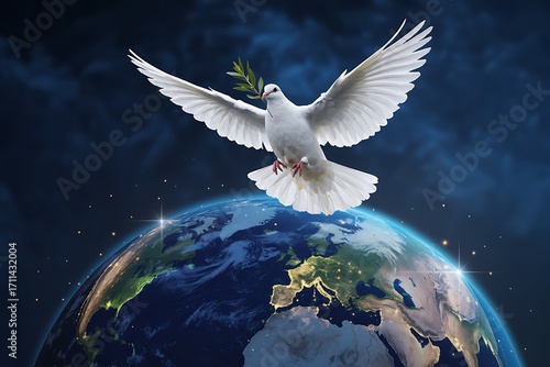 Inspiring white dove carrying olive branch soars above Earth, symbolizing global peace and harmony today