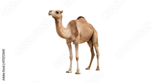 Isolated dromedary camel standing tall, portrait of one-humped desert animal, sand tones fur