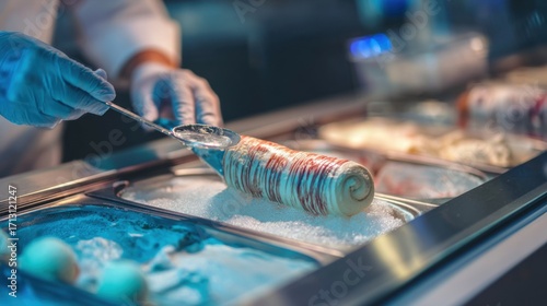 A Skilled Chef Skillfully Prepares Delicious Rolled Ice Cream with Tantalizing Flavors and Fresh Ingredients in a Vibrant Dessert Shop Setting