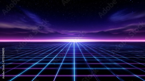 Retro futuristic grid landscape shining under the stars