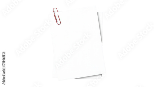 A stack of blank white paper notes held together by a single pink paperclip isolated on transparent background