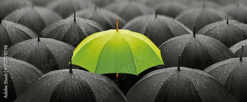 A single vibrant green umbrella stands out amongst numerous rain-soaked black umbrellas