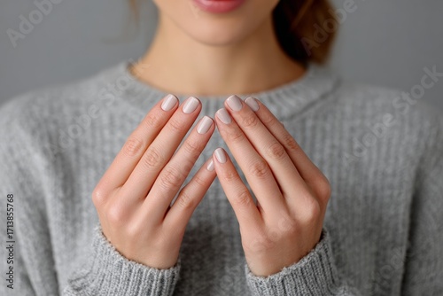Close-up of young caucasian female displaying neutral nail polish manicure