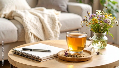 Relaxing hygge moment in a cozy living room with a warm cup of herbal tea, a journal, and a bouquet of fresh wildflowers