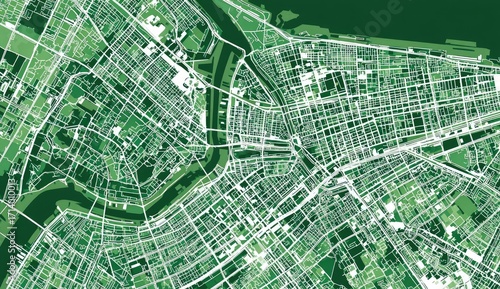 Urban map of a city with water features. Green shaded areas represent landmasses, while white lines indicate streets, waterways, and boundaries. Darker green depicts denser urban areas