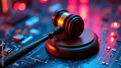 Mazo de madera sobre una placa de circuito futurista con luces de neón. Simboliza la tecnología legal, la privacidad de datos y la justicia moderna en el ciberespacio