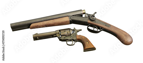 sawn off shotgun and revolver , old west guns isolated on transparent background