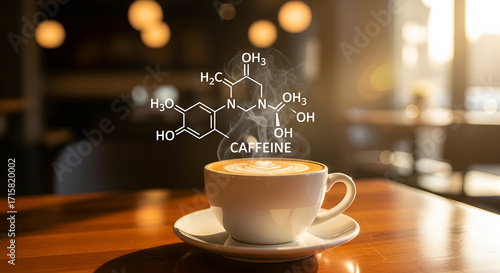 Steaming cup of coffee with caffeine molecule structure over warm cafe background