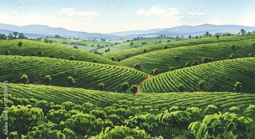 緑豊かな丘陵地帯の壮大な茶畑風景
