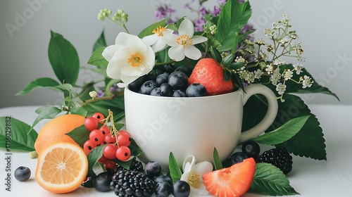 Fresh berries orange slices and wildflowers arranged in a white mug fruits