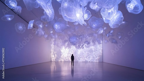 Floating jellyfish art installation in modern gallery