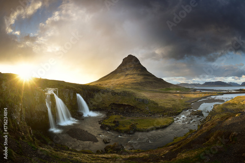 wide angle picture of Kirkjufellsfoss with the Kirkjufell (church mountain) in the background. On the northern coast of Snaefellsnes peninsula in Iceland.