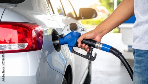 A person's hand holding a blue fuel pump nozzle while refueling a modern silver car at a gas station