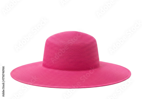 A single, vibrant hot pink wide-brimmed straw hat with intricate woven texture and gently curved brim on a transparent background with soft high-key studio lighting, summer fashion accessory concept
