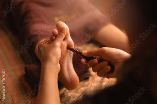 Relaxing thai foot massage with reflexology techniques wooden stick in tranquil spa setting