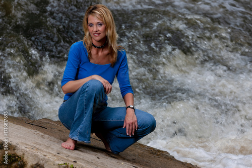 Gorgeous Blonde Model Enjoying The Warm Weather Near A Waterfall