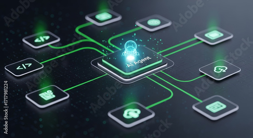 Modern AI agent connecting with data and code for intelligent automation and cloud services solutions on dark tech background