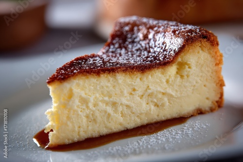 Basque Cheesecake. Close-Up Photo of Delicious Homemade Cake on White Plate