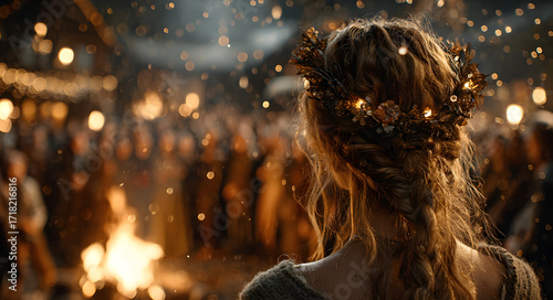 Woman from behind with wreath and lights, dancing around bonfire with blurred crowd during pagan solstice ritual. Yule celebration concepts for winter holiday.
