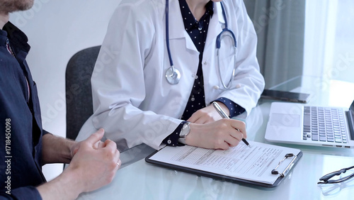 Doctor and patient are talking in clinic after usual health check up. Female physician is making notes awhile man is describing something. Medicine concept