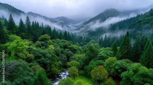 Lush Green Rainforest with Misty Morning Fog and Mountainous Backdrop