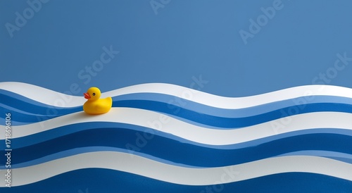 Minimalist composition of blue and white horizontal waves with a yellow rubber duck against a clean white background, high-resolution style image evoking calm water and playful bath time concept