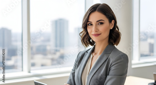 Confident, professional businesswoman with a warm smile poses in a modern office with city views, embodying success and ambition.