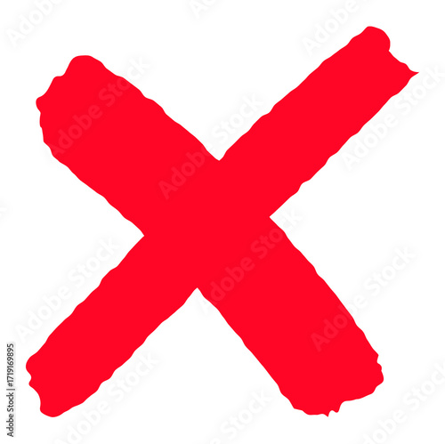 Red hand-drawn cross icon, bold painted cancel symbol, wrong and error sign in artistic textured brush style for alerts, digital design, and UI graphics