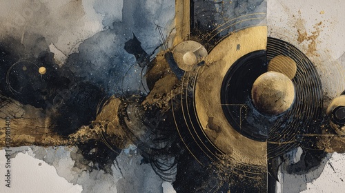 Abstract art piece featuring swirling, golden, and dark-blue forms