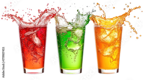 Three colorful refreshing drinks splashing in tall glasses isolated on transparent background