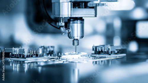 Close-up of a precision CNC machine operating on a metal workpiece in a manufacturing environment