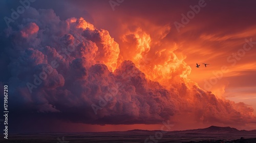 Stormy sunset sky dark thunderclouds dramatic orange horizon birds flying contrast between chaos and beauty epic landscape