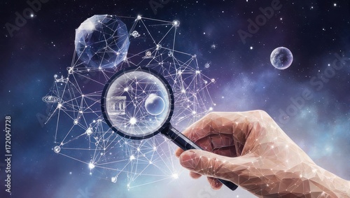 Discovering cosmic connections and new frontiers with a magnifying glass exploring the vast universe and complex networks of data.