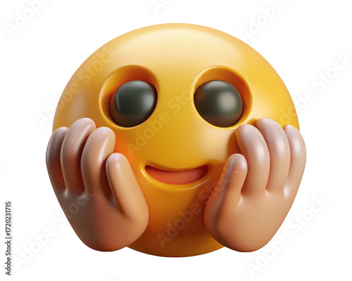 Adorable emoticon with hands on face expressing coquettish shy behavior in yellow shade rendering 3d illustration isolated on transparent background