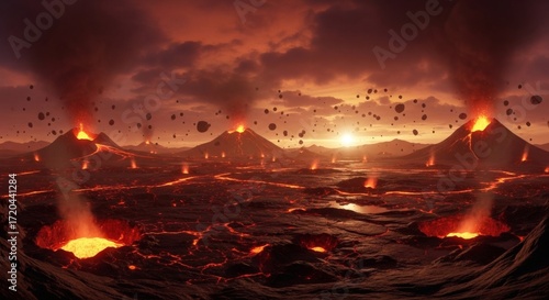 Hadean Eon Volcanic Landscape – Early Earth Formation with Lava and Meteor Impacts