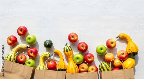 Autumn harvest bounty of apples and gourds overflowing from brown paper bags, displayed on a bright white wooden surface with copy space.