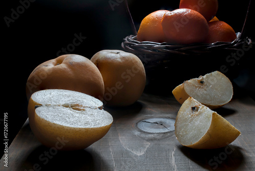 Still life photography, Renaissance Baroque style, with Asian pears on a rustic wooden table with a basket of mandarins in the background, backlit in a chiaroscuro style.