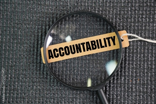 A magnifying glass and a paper tag with the word ACCOUNTABILITY. the acceptance of responsibility for your own actions, decisions, and performance, coupled with the obligation to explain them