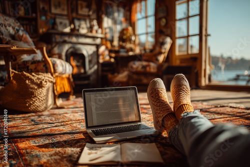 Dziewczyna ucząca się lub pracująca w domu na podłodze – komfort i koncentracja