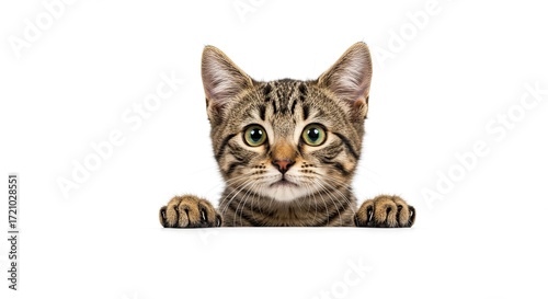 A cute tabby kitten with green eyes peeks over a white ledge, looking directly at the viewer.